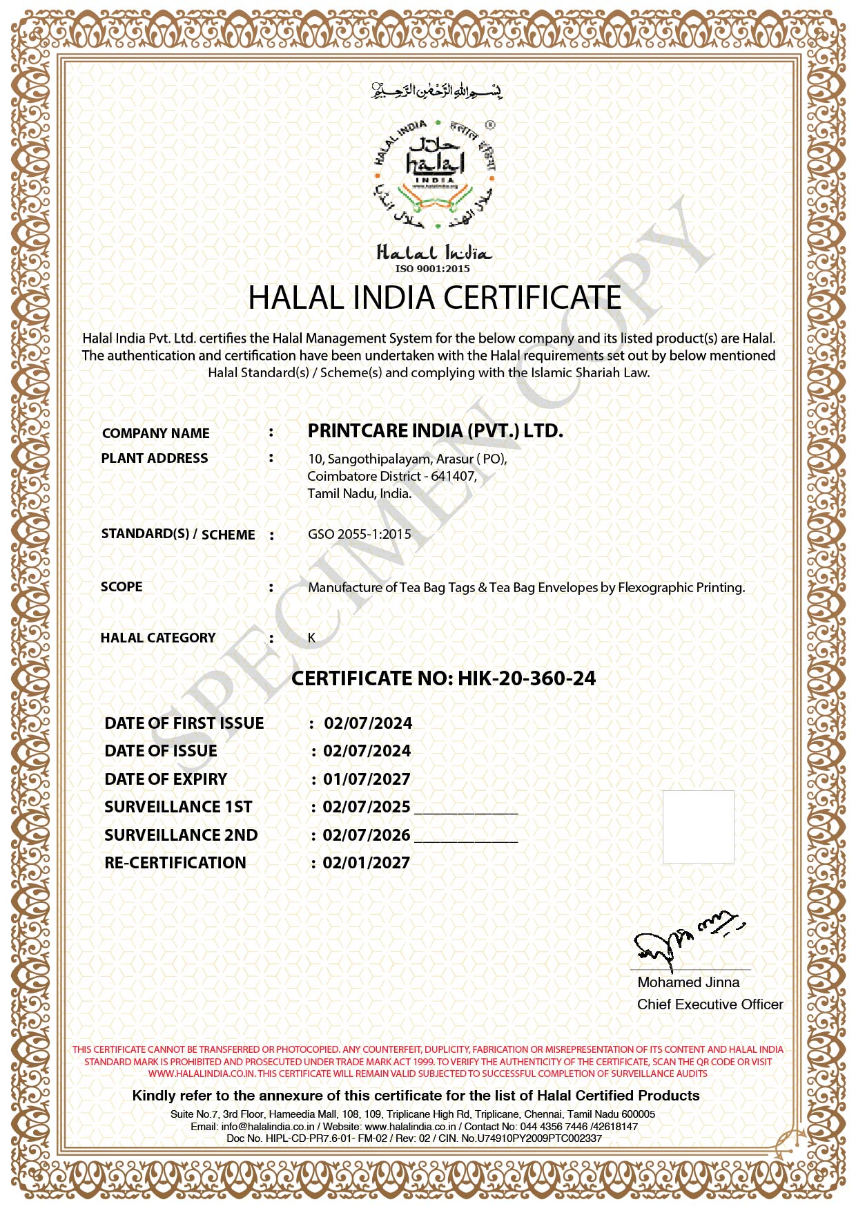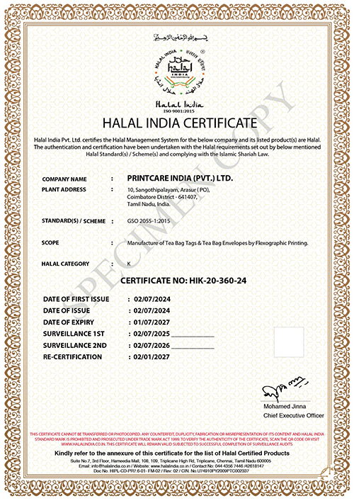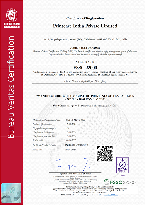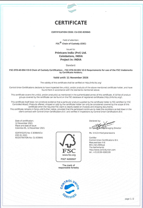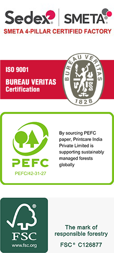 Printcare India (Pvt) Ltd is an ISO 9001:2015 &FSSC 22000, ISO 22000:2018 / ISO TS 22002-4 2013, SEDEX Members Ethical Trade Audit (SMETA - Four Pillar), Forest Stewardship Council (FSC) and PEFC (Programme for Endorsement of Forest Certification) certified company, which is a testimony to its high standard in quality. Our quality management is focused not only on product quality, but also the means to achieve it.