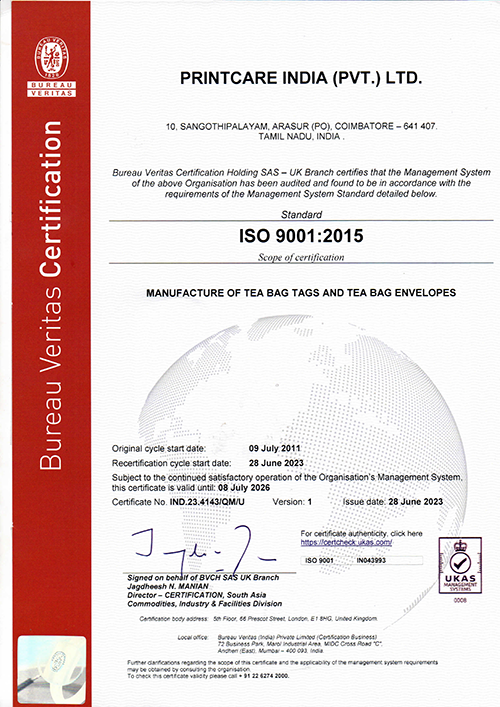 Our core principles of quality are based on a focus on the customer, participation, teamwork and continuous improvement. We pride ourselves on offering a truly premium print quality for all teabag tags and teabag envelopes, which meets food safety requirements for packaging, product functionality requirements and almost all teabag packaging machinery specifications.